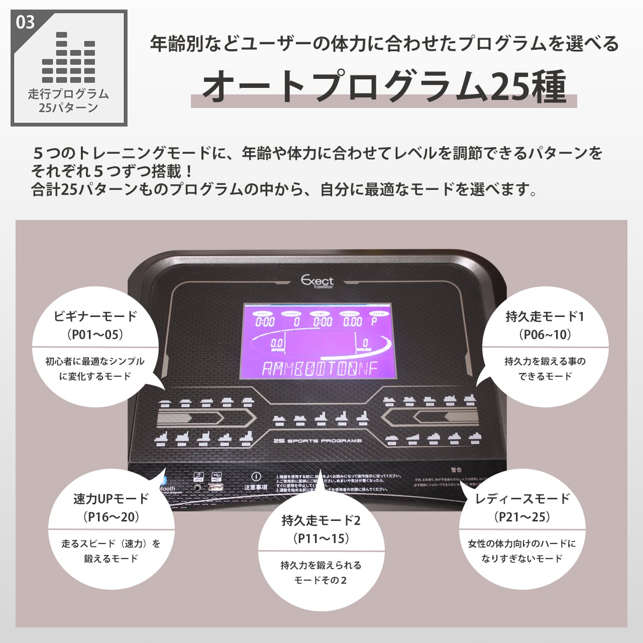 スピードと傾斜角度を自動で変更する走行プログラムも25パターン搭載し、自分に合ったトレーニングを自宅で気兼ねなく行うことができます!